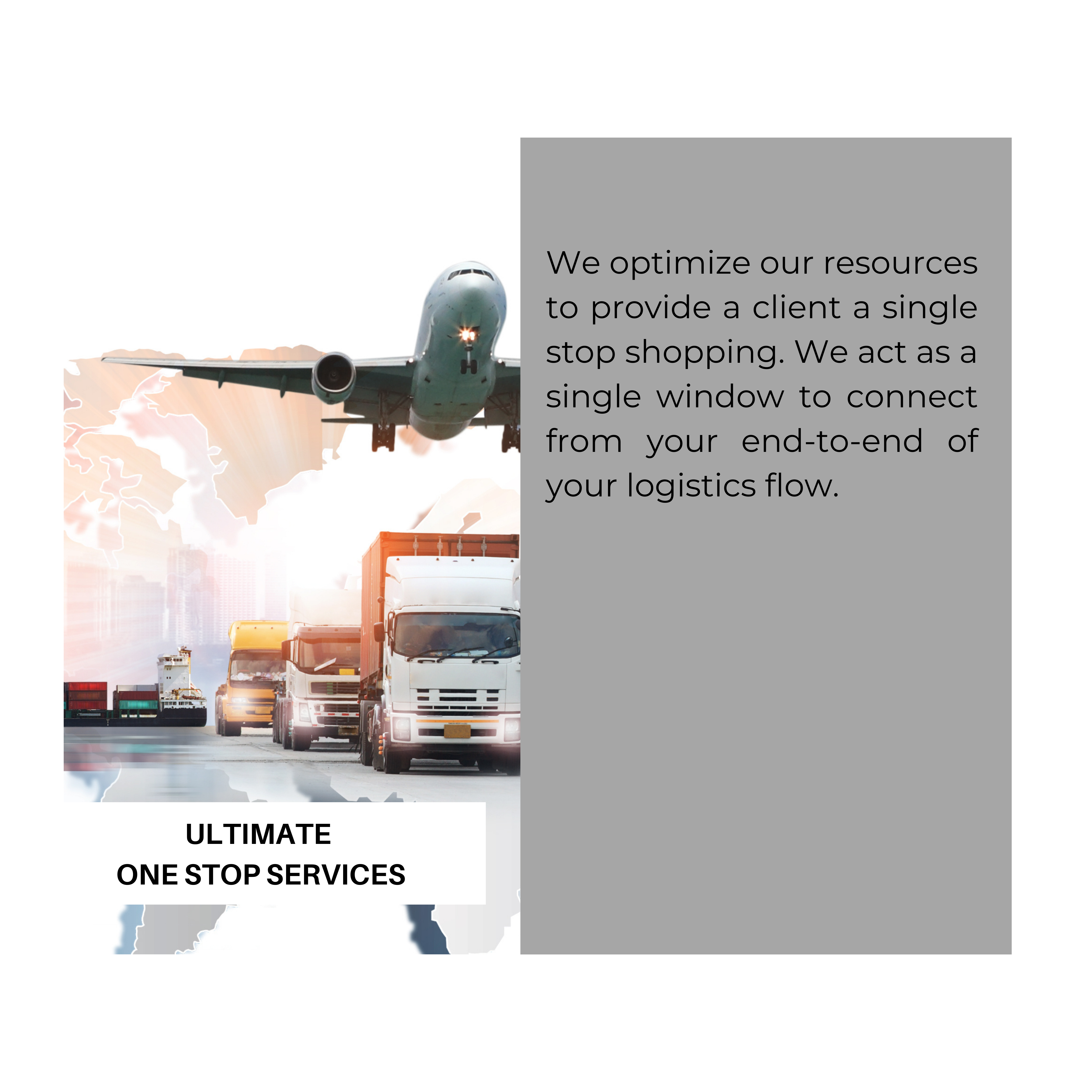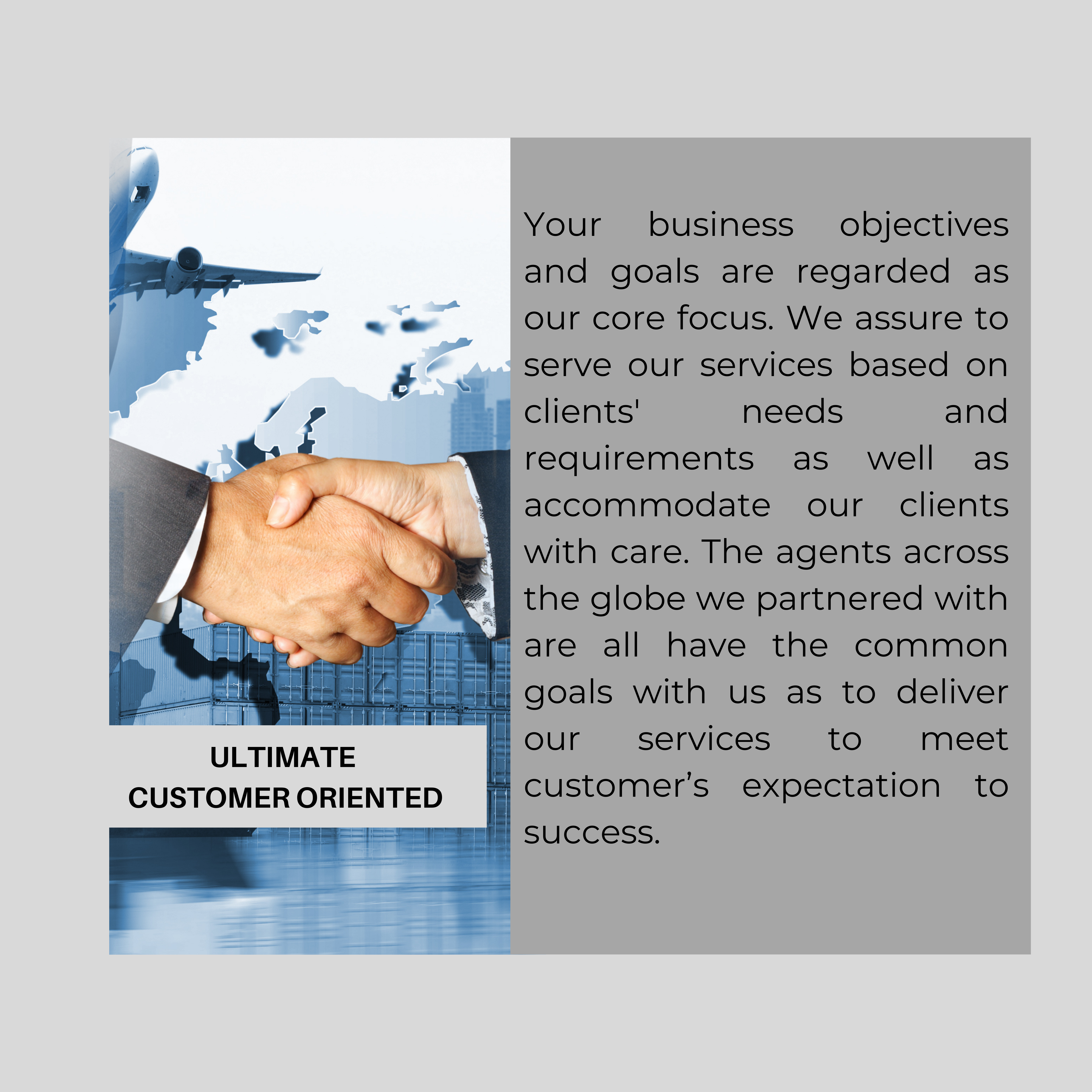 With our integrate ranges of experiences and knowledge, we orginate our new business which it allows the client to be worry free and enjoy their time doing something else after placing the shipments with us. The services will be served and customized based on your needs and requirements.